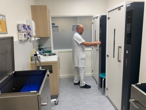 In de polikliniek op locatie ETZ Elizabeth hebben we één ruimte ingericht voor voorreiniging en desinfectie. Hier staan twee D60's naast elkaar. Er zijn twee medewerkers aangenomen die verantwoordelijk zijn voor het desinfecteren van de endoscopen. Boven de spreekkamers hangt een lampje dat gaat branden als er een gebruikte scoop in de spreekkamer hangt. Deze wordt dan verzameld en naar de desinfectieruimte gebracht. Hier hebben we houders voor eenvoudige handmatige reiniging van gebruikte endoscopen. Deze endoscopen worden om de beurt voorgereinigd en krijgen een lektest. Daarna kunnen ze in 60 seconden gedesinfecteerd worden in de D60 en zijn ze weer klaar voor gebruik.